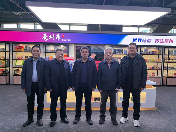 孔庆玉(左2)、李彬(中)、张军(左1)、杨志伟(右1)在上海国展安徽省“百县千品”亳州展区巡展